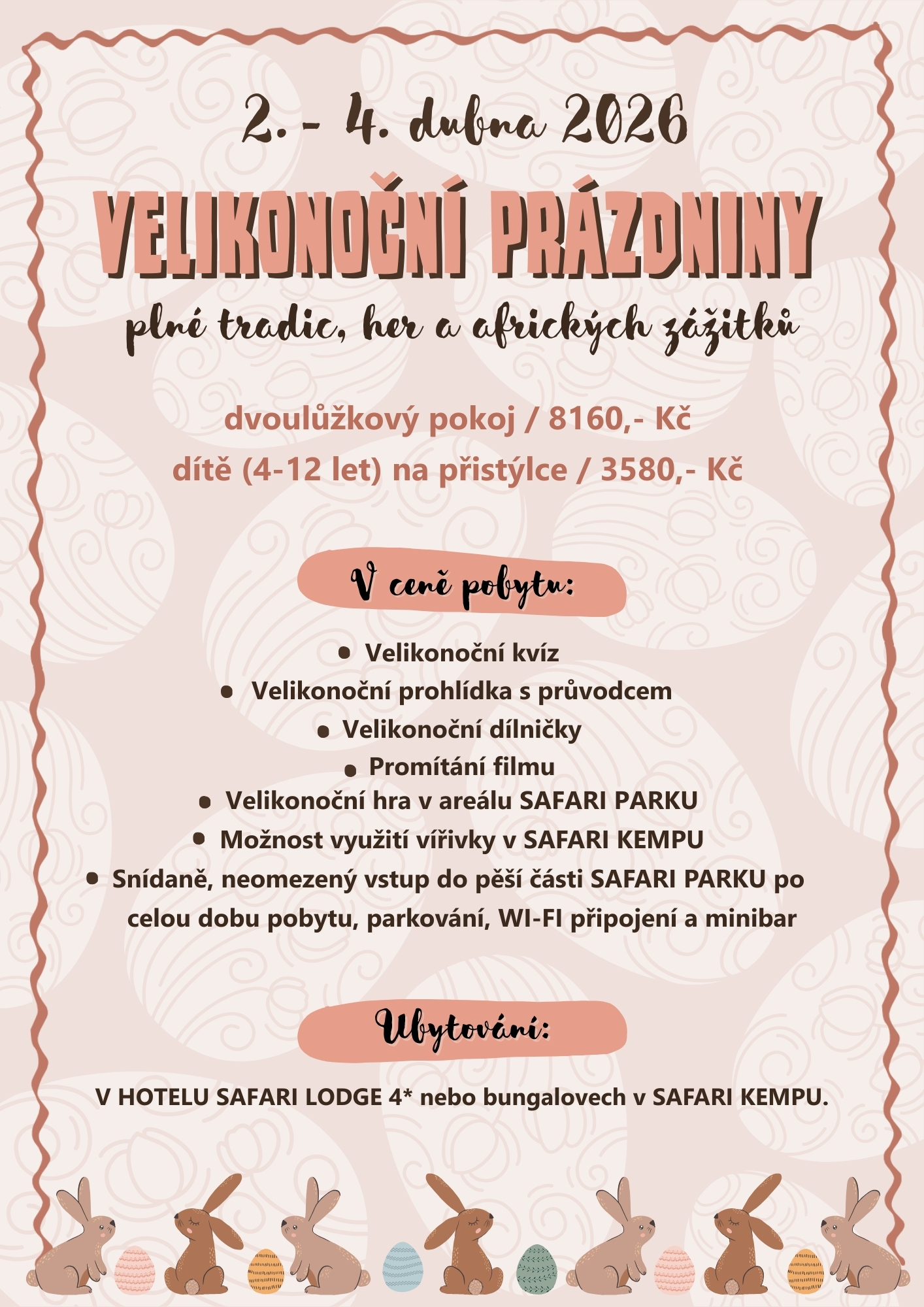 Minimální délka pobytu jsou 2 noci. Po zadání termínu do systému jsou nabízeny POUZE VOLNÉ TYPY UBYTOVÁNÍ, pokud se vám vybraný typ neukáže, je v tomto termínu obsazen, můžete zkoušet jiné termíny nebo si zavolat na recepci a dostupnost si ověřit